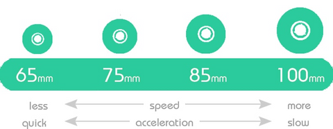 The Diameter decides the top speed and the acceleration of your skateboard. If you look for stability and speed, the bigger wheel meets all your needs. If you need faster acceleration and a lighter wheel for tricks, the smaller wheel can handle all of these in all aspect. Wheels 65 mm and below are often for cruising, skate park, and other trick disciplines. 65-75 mm are for cruising, downhill, and pumping boards. 75 mm+ are for cruising, long-distance, and Esk8. The diameter of the wheel offers us a general idea of the wheel size affection, but all the size categories have exceptions.